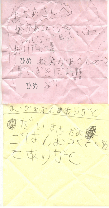 おかあさんへおかあさん いつも いろんなことをしてくれて ありがとう!ひめは おかあさんのこと だいずきだよ!!ひめより