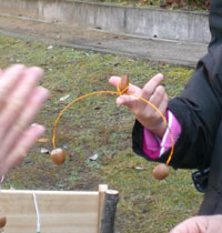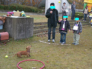 投げたボールをワンちゃんに阻止されずに 輪の中に入れるというゲームで
